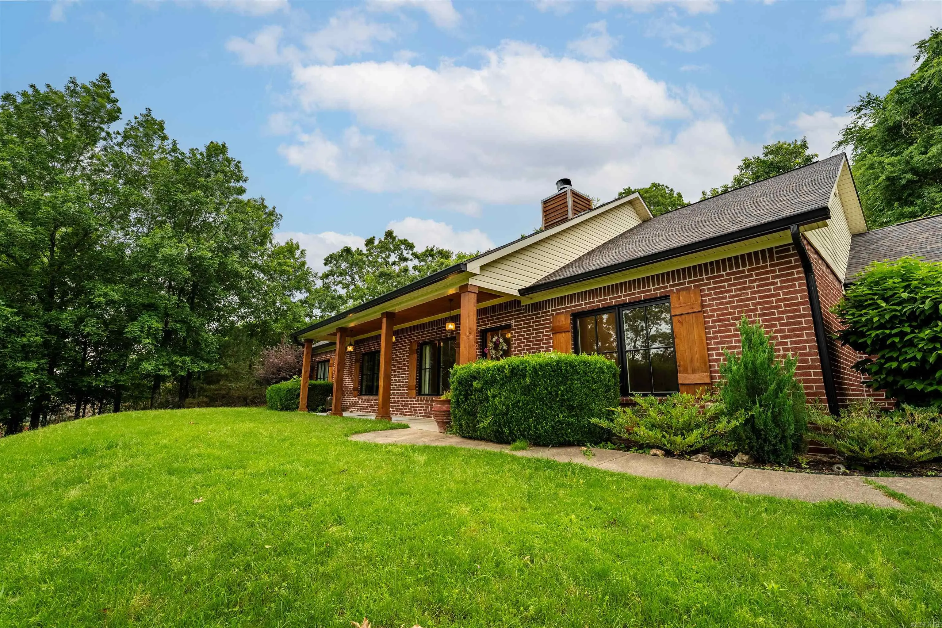 This immaculate 4 Bed, 2 Bath oasis sits atop Bald Eagle Dr with stunning views of the Ouachita Mountains. A private tree-wrapped circular drive welcomes you to a charming covered patio and elegant Marvin Signature wood & mahogany doors/windows. Inside, the vaulted great room boasts a stone wood-burning fireplace and a wood-beamed kitchen with a breakfast island, custom cabinetry, smart vent-hood, stainless appliances, brick backsplash, and double doors to your private patio overlooking peaceful acreage. Follow the rock path past your campfire setup to a pool with a new liner and pump—perfect for summer days and starry nights. The private primary suite includes a walk-in shower, jetted tub, double vanities, and double closets. Through the laundry room, find an office and oversized storage closet. Three guest bedrooms share a full bath on the opposite wing. Additional features include a newer roof, updated electrical, and a 2-car garage with workshop space.
