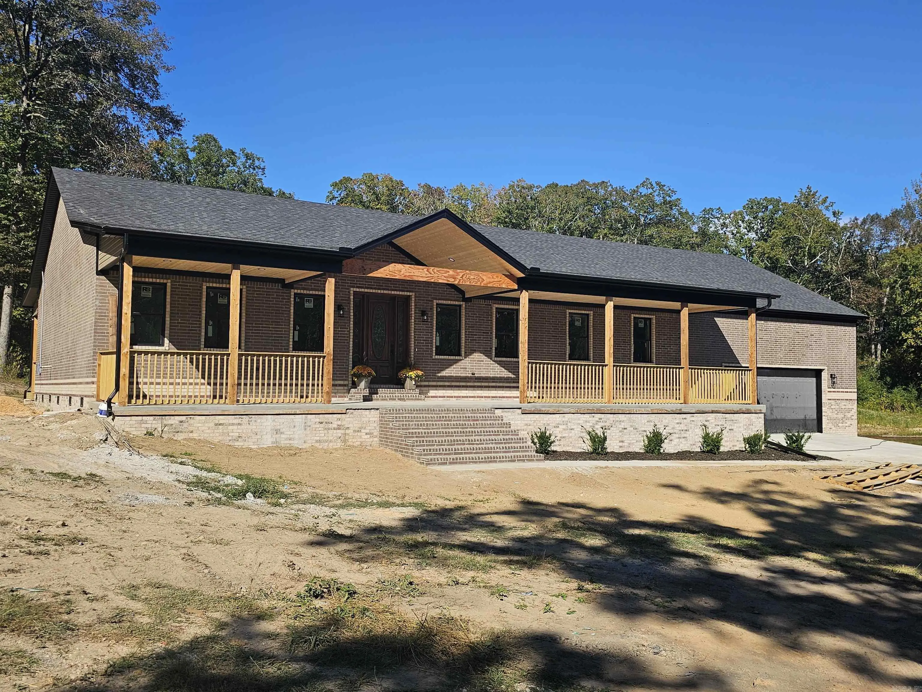 This all-brick new construction home is located outside the city limits on 4.46 level acres with a small pond. The front and back porches stretch across the house and feature tongue-and-groove wood ceilings. Inside, the open floor plan includes a spacious kitchen with abundant cabinetry, a large island, gas cooktop, wall oven with microwave, a coffee bar, and a walk-in pantry. There is also a dedicated office space. Two guest rooms are on one side of the home, and the primary suite is on the other. The primary ensuite offers two vanities, a large tiled walk-in shower, soaking tub, and two walk-in closets—one with direct access to the laundry room for convenience. The property includes a 1,200 sq ft garage and offers the peaceful setting of country living just minutes from town. See agent remarks.